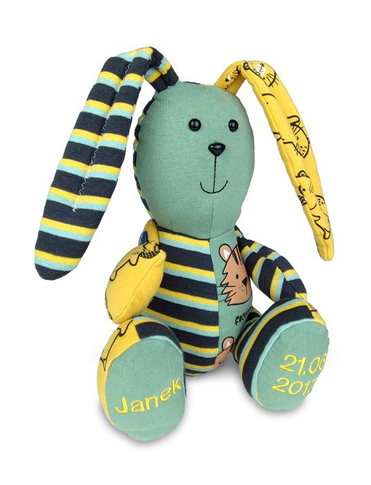 Twoje dziecko wyrosło z ubranek, a Ty nie potrafisz się z nimi rozstać? Ten piękny Długouchy Królik uszyty w całości z ubranek Twojego dziecka, z pewnością stanie się najlepszym przyjacielem, oraz pamiątką na zawsze.