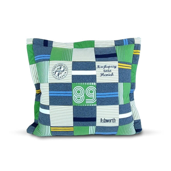 Poduszkę uszyjemy w całości z Twoich ubrań, które do nas wyślesz, zarówno tył, jak i przód poduszki. Jej przód uszyjemy ze starannie wyciętych kwadratów (w ilości 25 sztuk), w postaci tak zwanego patchwork. Dodatkowo, przód poduszki podszyty jest ocieplaczem, co sprawia, że jest jeszcze bardziej wytrzymała, elegancka i przyjemna w dotyku.