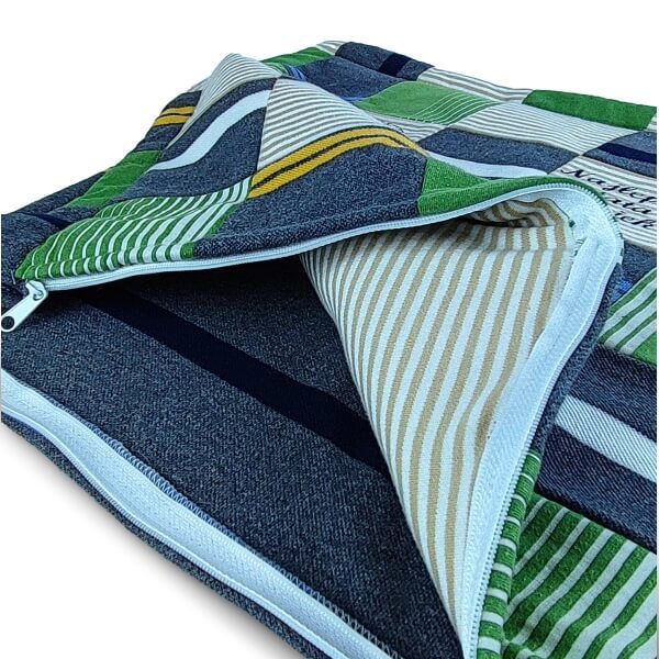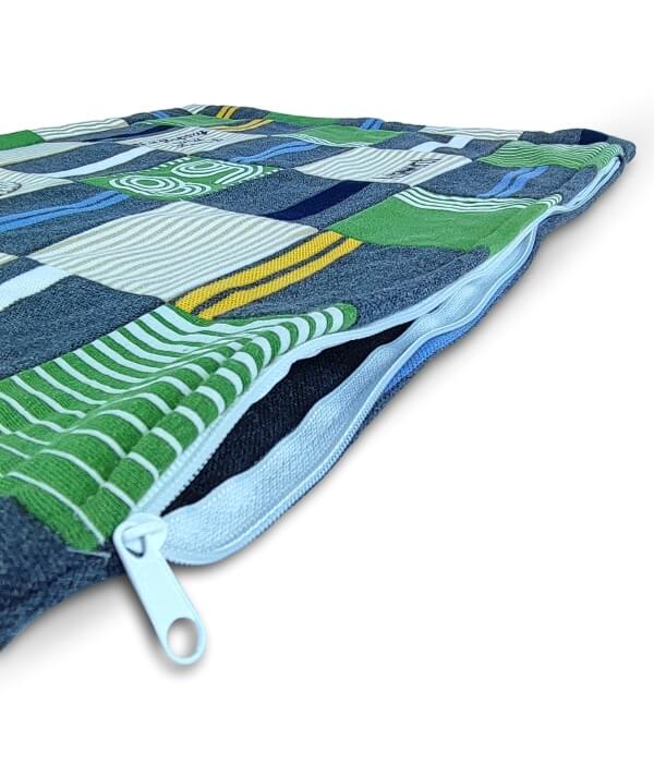 Poduszkę uszyjemy w całości zarówno przód jak i tył z ubrań, które wyślesz do nas. Jej przód uszyjemy ze starannie wyciętych kwadratów (25 sztuk) w postaci patchwork. Dodatkowo przód poduszki podszyty jest ocieplaczem, co sprawia, że jest jeszcze bardziej wytrzymała, elegancka i przyjemna w dotyku.